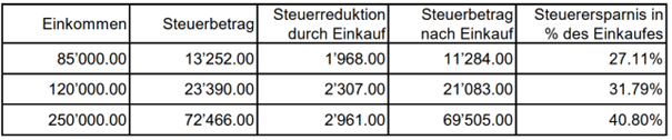 Die Beispiele sind bei einem gleichbleibenden Vermögen von CHF 200'000.00 für eine alleinstehende Person mit römisch-katholischer Kirchensteuer gerechnet. Ein Einkauf von CHF 7'258.00 hat folgende Auswirkung auf den Steuerbetrag: