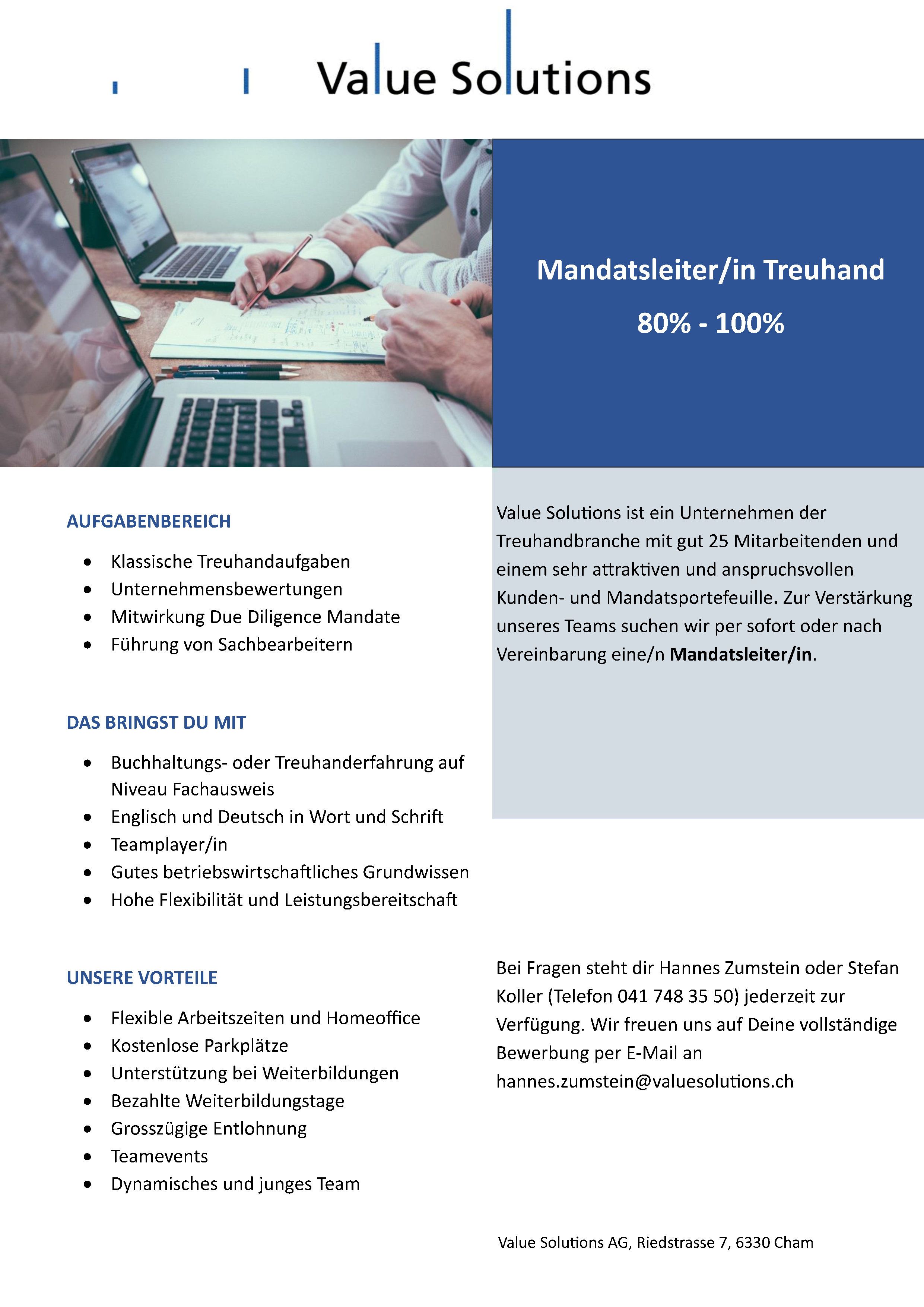 Value Solutions Treuhand und Unternehmensberatung AG | Hinterbergstrasse 17 | 6330 Cham+41 (0)41 748 35 50 | Diese E-Mail-Adresse ist vor Spambots geschützt! Zur Anzeige muss JavaScript eingeschaltet sein!